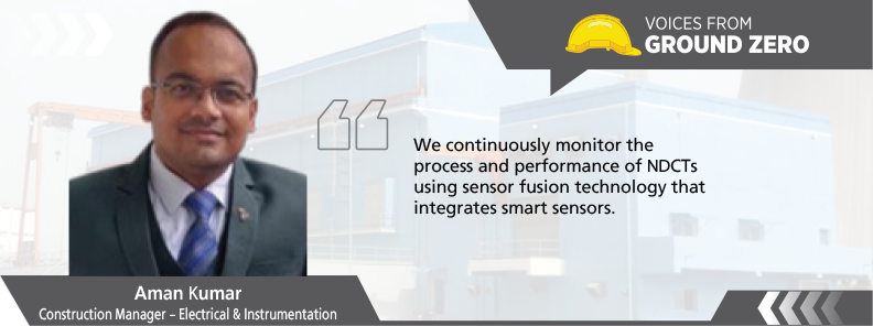 Sensor fusion technology: “We continuously monitor the process and performance of NDCTs using sensor fusion technology that integrates smart sensors including ultrasonic flow transmitters, hot and cold-water temperature sensors, RH and temperature transmitters for wet and dry bulb readings, TDS analysers for water concentration, and motionless thermal mass flowmeters for air velocity measurement,” informs Aman Kumar, Construction Manager – Electrical & Instrumentation. He adds that commissioning of electrical components – such as transformers, PMCCs, VVVFDs, panels, and instruments – was accelerated using on-site testing kits. A comprehensive understanding of each component has led to accurate diagnostics and proactive issue resolution, resulting in smoother commissioning.