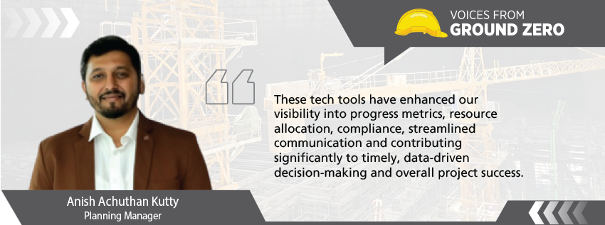 Recognizing the transformative potential of technology, the team has proactively integrated a range of digital applications into their daily workflows throughout the project lifecycle, facilitating real-time tracking, efficient monitoring, and seamless coordination of project essentials. “These tech tools have enhanced our visibility into progress metrics, resource allocation, compliance, streamlined communication and contributing significantly to timely, data-driven decisionmaking and overall project success,” apprises Planning Manager, Anish Achuthan Kutty.