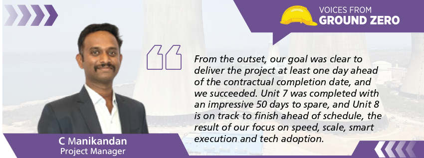 “From the outset, our goal was clear: to deliver the project at least one day ahead of the contractual completion date,” declares Manikandan, enthusiastically, “and we succeeded. Unit 7 was completed with an impressive 50 days to spare, and Unit 8 is on track to finish ahead of schedule, the result of our focus on speed, scale, smart execution and tech adoption.”
