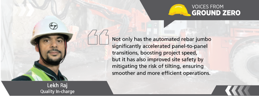 The traditional rebar jumbos, used for waterproofing membrane and rebar installation, relied on manual mechanical force and auxiliary equipment like pick-and-carry cranes, along with significant manpower, to move between panels on rail wheels which was time-consuming, and hazardous due to the risk of the moving jumbo tilting from the rail line. The team ‘innovated’ an automated movement system, incorporating an electric motor and gearbox enabling the jumbo to move automatically and independently, eliminating the need for external mechanical equipment, reducing the need for additional manpower, and dramatically reducing the time previously spent on resource arrangement and movement. Quality In-charge, Lekh Raj is thrilled with his team’s innovation. “Not only has this enhancement significantly accelerated panel-to-panel transitions, boosting project speed, but it has also improved site safety by mitigating the risk of tilting, ensuring smoother and more efficient operations.”