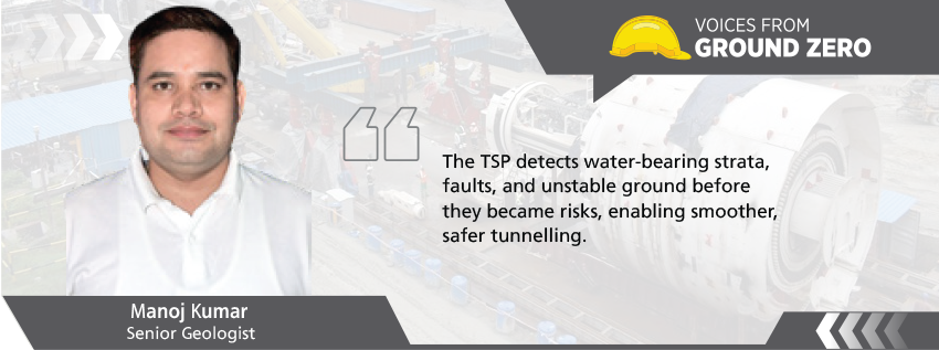 A major contributor to risk mitigation was the Tunnel Seismic Prediction (TSP) enabling teams to detect geological anomalies up to 100 m ahead of the TBM face. “The TSP detects water-bearing strata, faults, and unstable ground before they became risks, enabling smoother, safer tunnelling,” explains Senior Geologist Manoj Kumar.