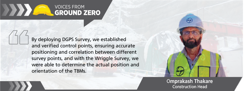 “By deploying DGPS Survey, we established and verified control points, ensuring accurate positioning and correlation between different survey points,” says an exultant Construction Head, Omprakash Thakare, “and with the Wriggle Survey, we were able to determine the actual position and orientation of the TBMs.” The survey ensured accurate tunnel alignment and its construction according to design specifications, helping the team detect deviations from the planned tunnel alignment to take timely corrective actions, reduce errors and minimize rework.