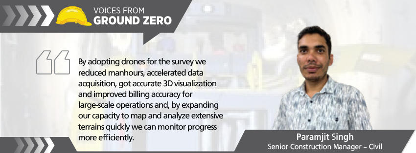 Very early in the piece, the team realized the difficulty of using traditional methods of surveying considering the time & manpower required to establish control points, conduct detailed tunnel section scans, and ensure precise alignment across long tunnel stretches, that could potentially impede the pace & progress of construction for Paramjit Singh, Senior Construction Manager – Civil, in charge of Project Planning & Controls. Further, manual ground surveys could hardly provide comprehensive 3D visualization for rapid site assessments and accurate volumetric calculations of the extensive earthworks, directly impacting project speed and financial accuracy at scale. “By adopting drones for the survey we reduced manhours, accelerated data acquisition, got accurate 3D visualization and improved billing accuracy for large-scale operations,” he shares, “and, by expanding our capacity to map and analyze extensive terrains quickly, we can monitor progress more efficiently.”
