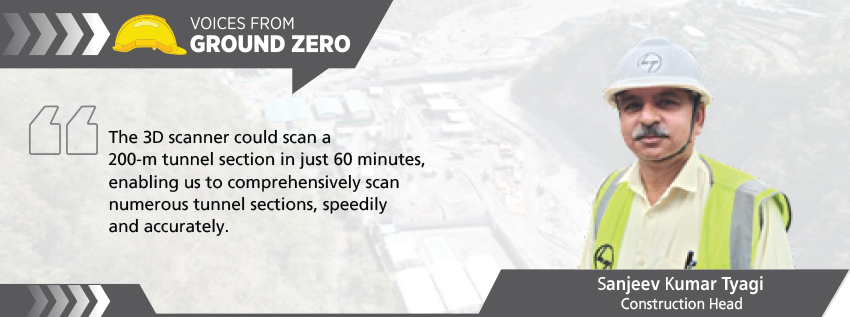 3D Scanner: Using traditional equipment to capture detailed and accurate data for mass quantities of open works and 200-m tunnel sections would have been slow and inefficient, taking approximately 400 minutes per section, severely limiting the team from conducting frequent quality control checks, measuring progress, and adapting quickly to changing ground conditions, thereby impeding operational speed and the scale of detailed analysis. The answer lay in a 3D Scanner that delivered accurate scans with multiple data points and was exceptionally efficient for large volumes. “The 3D scanner could scan a 200-m tunnel section in just 60 minutes, enabling us to comprehensively scan numerous tunnel sections, speedily and accurately,” says a delighted Sanjeev Kumar Tyagi, Construction Head.