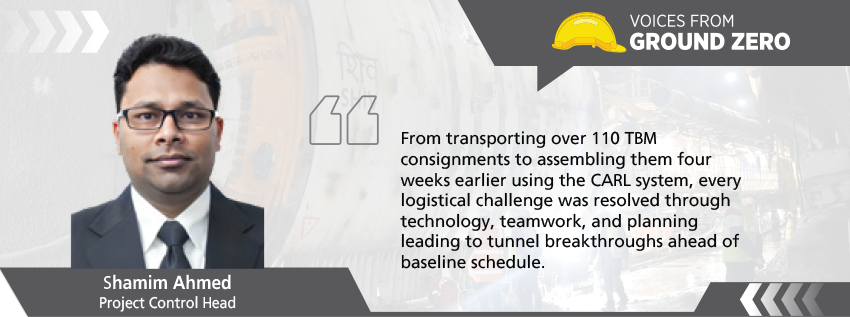 The Workmen Application System and Segment Documentation System (SDS) provided real-time control over tunnelling which streamlined workflow coordination and resource planning, with production reaching 642 rings equivalent to 1,091.4 m of lining instead of the originally planned 600 rings. These platforms ensured synchronized workflows between labour, casting yards, and tunnel advancement. As Shamim Ahmed, Project Control Head, noted: “From transporting over 110 TBM consignments to assembling them four weeks earlier using the CARL system, every logistical challenge was resolved through technology, teamwork, and planning leading to tunnel breakthroughs ahead of baseline schedule.”