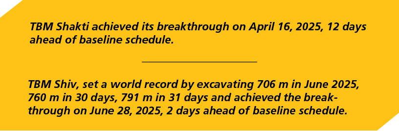 By integrating smart systems and engineering innovations, TBM Shakti achieved its breakthrough on April 16, 2025, 12 days ahead of baseline schedule while TBM Shiv, set a world record by excavating 706 m in June 2025, 760 m in 30 days, 791 m in 31 days and achieved the breakthrough on June 28, 2025, 2 days ahead of baseline schedule, demonstrating peak performance in one of the world’s most challenging tunnelling environments.