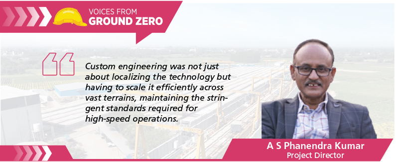 “The Japanese systems are built on decades of precision engineering and operational excellence but adapting and tailoring them to India’s unique geographical, climatic, and logistical conditions required a lot of custom engineering,” observes Project Director, A S Phanendra Kumar. “Custom engineering was not just about localizing the technology but having to scale it efficiently across vast terrains, maintaining the stringent standards required for high-speed operations.