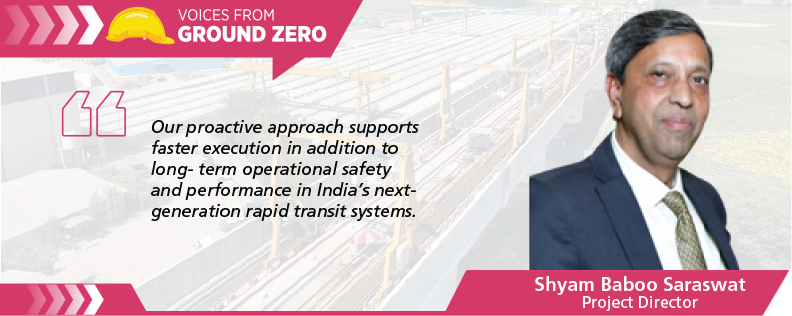 Despite facing difficulties in transporting and stacking heavy slabs weighing up to 5.5 MT, especially within congested urban zones, restricted operating spaces, logistical hurdles and a workforce executing this kind of work for the first time, the team pulled off all the 135 installations flawlessly. “Close supervision, hands-on training, and constant technical support are the prime reasons of our success,” smiles Shyam, agreeing that maintaining minimum tolerances for slab alignment without causing structural damage was no laughing matter. These slab track turnouts will now serve as a backbone for efficient train movement, boosting the RRTS Metro’s operational flexibility and long-term reliability.