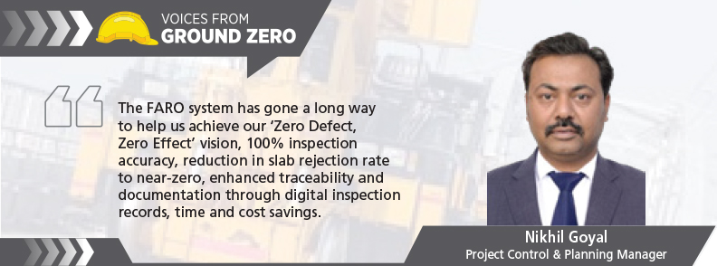 The FARO system inspects (non-contact dimensional) the precast slabs that measure over 4 m x 2.4 m and weighing over 4 tons, generates as-built 3D models to compare against design specifications and can detect minute surface undulations, alignment issues, and profile deviations. “The FARO system has gone a long way to help us achieve our ‘Zero Defect, Zero Effect’ vision,” shares Project Control & Planning Manager Nikhil Goyal, ticking off its various advantages. “100% inspection accuracy for critical dimensions (length, width, thickness, embed locations, curvature), reduction in slab rejection rate to near-zero, enhanced traceability and documentation through digital inspection records, time and cost savings due to minimized manual errors and rework and improved interface with installation teams through precise slab data.”