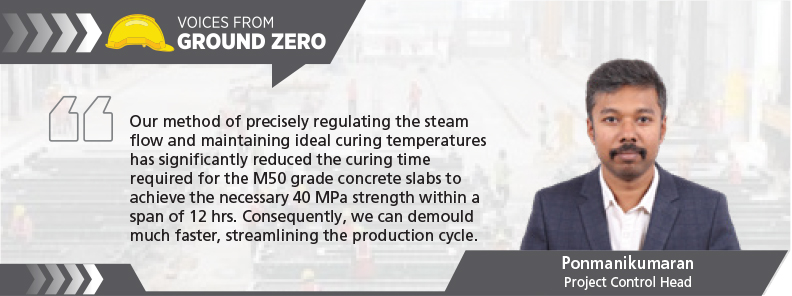 “Our method of precisely regulating the steam flow and maintaining ideal curing temperatures has significantly reduced the curing time required for the M50 grade concrete slabs to achieve the necessary 40 MPa strength within a span of 12 hrs. Consequently, we can demould much faster, streamlining the production cycle.”