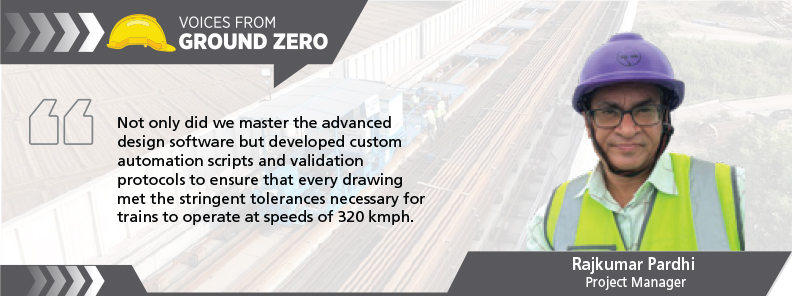 Aligning with Japanese standards demanded four-digit precision in all design outputs, alien to Indian railway projects. “With no prior experience of such accuracy levels, we still successfully adopted and implemented the required technology and workflows,” says Rajkumar, with a triumphant air. “Not only did we master the advanced design software but developed custom automation scripts and validation protocols to ensure that every drawing met the stringent tolerances necessary for trains to operate at speeds of 320 kmph.”