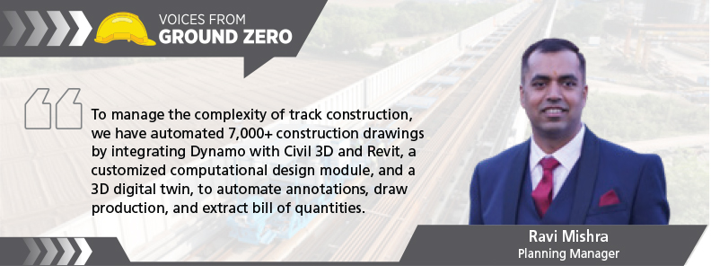 “To manage the complexity of track construction, we have automated 7,000+ construction drawings by integrating Dynamo with Civil 3D and Revit, a customized computational design module, and a 3D digital twin, to automate annotations, draw production, and extract bill of quantities (BOQ),” explains Planning Manager, Ravi Mishra.