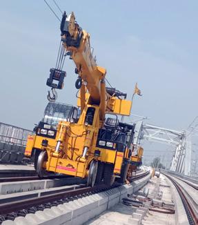 “After evaluating various lifting methods and techniques for a cost effective and safe solution to reduce damage to the slabs, we selected a 360-degree self-propelled rail-cum-road crane with a carrying capacity of 20T, capable of operating both on rail tracks and the viaduct,” he informs with a sense of achievement. Equipped with two powered bogies, the crane has a hydrostatic drive on rail and when operating on rails, the rubber tires are raised, and can travel at speeds of up to 20 km/h. Apart from emergency stop buttons, a pneumatic fail-safe service and parking brake system are in place, with an auxiliary pneumatic circuit for easy switching between rail and road braking modes while sensors can mechanically lock the crane to ensure safety. Dual mechanical locks on each bogie ensure safe movement and in case of engine or hydraulic failure, a manual towing mode can be engaged, with towing speeds of up to 10 km/h. Speeds are restricted by a PLC.