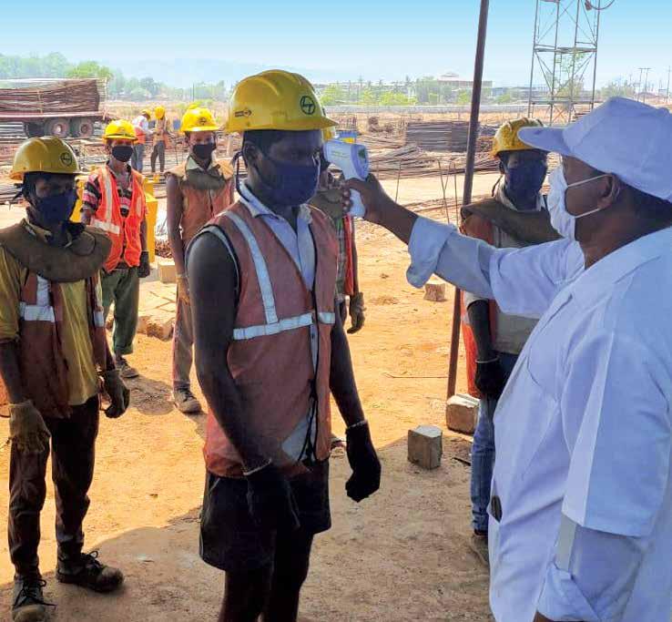 The Admin and IR teams at the MNEP ensured the health and safety of nearly 1500 workmen and 220 employees led by Satish Koti in Camp-1 and B. Kishore Kumar in Camp-2 guided by Vikranth Joshi, Rajasekhar, PV Santhosh Kumar and Girish Nandhyal. The Aurangabad Karodi Road project (KARP) team had to safeguard about 89 employees, 210 departmental workmen and 545 contract workmen with a team led by Project Manager, Randhi Surya Rao, EHS, Sarju Nadan Patra, IR Manager, Yugal Kishore Gupta and Site In charges – Bharat Singh and Pankaj Kale. “We deployed a micro monitoring plan,” informs Surya Rao. “dividing all the workmen into groups of 25 each with a mentor (respective engineer) appointed for each group whose responsibility was to take care of his group and keep me informed of developments on a regular basis.”